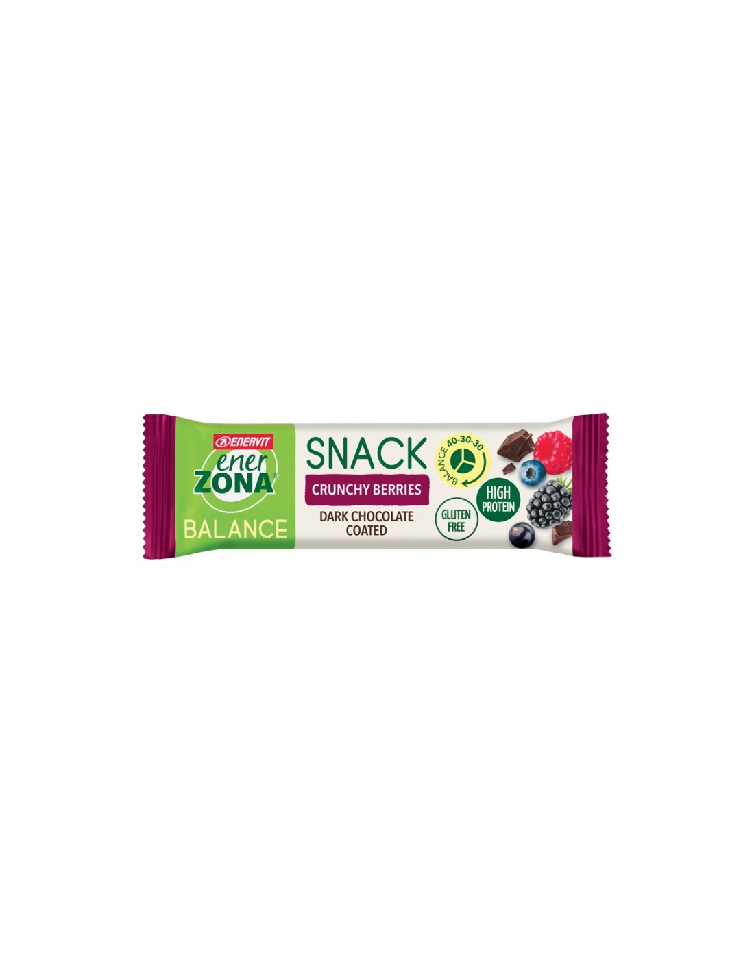 La barretta snack Enerzona Balance è dedicata a coloro che seguono il programma Dieta a Zona per la perdita di peso o per chiunque voglia mantenere la linea sotto controllo. Lo Snack Crunchy Berries è una barretta doppio strato (croccante e morbido), ai frutti di bosco e cacao, ricoperta al cioccolato fondente. La Barretta è ricca di proteine e fibre. SENZA GLUTINE e senza Olio di Palma.