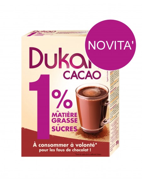 Il cacao magro Dukan è stato sviluppato per non far percepire la dieta come un regime alimentare che non gratifica il palato. Al contrario, il cacao magro Dukan è goloso come il cacao tradizionale, ma con solo l'1% di materia grassa. Inoltre, il cacao magro Dukan 1% conserva tutte le proprietà energizzanti e antistress del cacao, ricco di antiossidanti e attivo contro il colesterolo cattivo. Inoltre il Cacao Magro Dukan è una fonte naturale di magnesio, ricco in vitamine, minerali, fosforo e oligoelementi (Ferro e Zinco). Grazie al suo gusto intenso, il Cacao Magro Dukan potrà sostituire in maniera eccellente il ben più calorico cioccolato tradizionale. Contiene solamente l'1% di materia grassa.