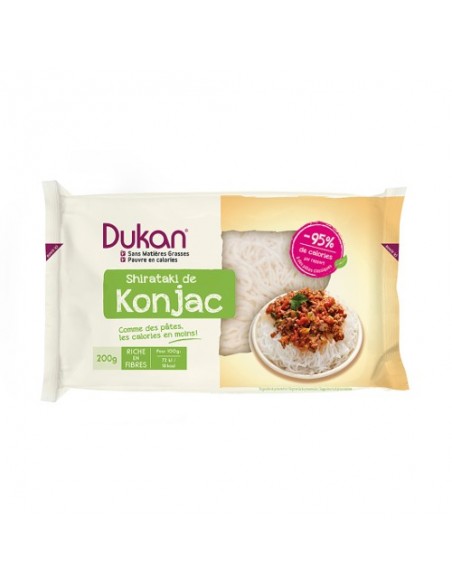 Gli Shirataki di Konjac Dukan sono la perfetta alternativa alla pasta per chi segue la dieta Dukan o qualsiasi programma alimentare iperproteico. Ricavati dall'Amorphophallus konjac, radice di una pianta asiatica ricca di glucomannano, gli Shirataki di Konjac Dukan sono molto simili agli spaghetti ma non contengono carboidrati e prevedono sole 10 Kcal ogni 100 g. Il glucomannano contenuto negli Shirataki è una fibra che cattura l'acqua con effetto saziante, stabilizzante sul colesterolo e regolarizzante per l'intestino. Gli spaghetti Shirataki di Konjac Dukan non contengono glutine.