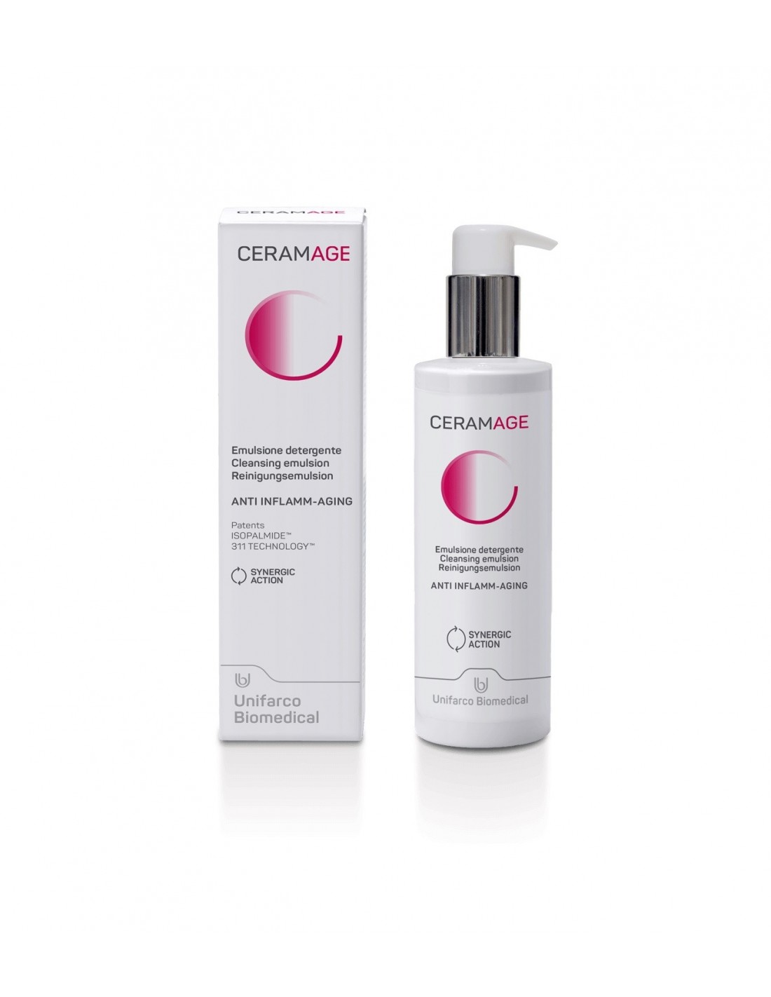 L'Emulsione Detergente Ceramage ideata da Unifarco Biomedical è un innovativo trattamento che contrasta i meccanismi complessi dell'invecchiamento della pelle di viso e collo. La sua formulazione contiene complessi brevettati come l'ISOPALMIDE, che modula i processi dell'inflamm-aging, TECNOLOGIA 311, una miscela di lipidi che ripara la barriera cutanea e la protegge dalla disidratazione, ACIDO TURMERICO, attivo contro lo stress ossidativo, e il RETINOLO H10 che stimola la rigenerazione cellulare. Questo trattamento detergente Ceramage è specifico per la detersione quotidiana dermo compatibile di viso e collo ed è studiato per aiutare a preservare la longevità della pelle andando a contrastare l'inflamm-aging, una naturale condizione di disequilibrio senza segnali evidenti che porta ad un'accelerazione dei processi di invecchiamento di tutte le cellule. La composizione dell'Emulsione Detergente Ceramage è il risultato di un'inedita associazione di componenti che agiscono sui fattori che promuovono l'invecchiamento precoce della pelle pur rispettando le caratteristiche fisiologiche della pelle, infatti deterge la pelle per affinità e non per contrasto. L'emulsione detergete è formulata per ridurre al minimo i rischi di allergie, non contiene conservanti, non contiene allergeni da profumo.