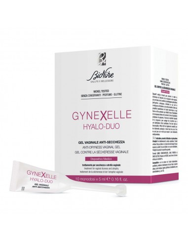 Hyalo-Duo Gynexelle Bionike è un gel vaginale ad azione anti-secchezza. Dispositivo medico formulato per prevenire e trattare secchezza e atrofia della mucosa vulvo-vaginale, legate a condizioni fisiologiche particolari (post-partum, menopausa, climaterio) o conseguenza di irritazioni o stress localizzati. Grazie alle proprietà bioadesive dell'acido ialuronico, forma un film protettivo che ristabilisce e mantiene il corretto livello di idratazione della mucosa intima. Arricchito con ingredienti protettivi e lenitivi favorisce il fisiologico trofismo della mucosa e dona sollievo ai fastidi causati dalla scarsa lubrificazione intima. Grazie all'elevata tollerabilità e biocompatibilità, Hyalo-Duo è indicato anche per trattamenti prolungati e in tutti quei casi in cui non si voglia o non si possa ricorrere a trattamenti farmacologici.