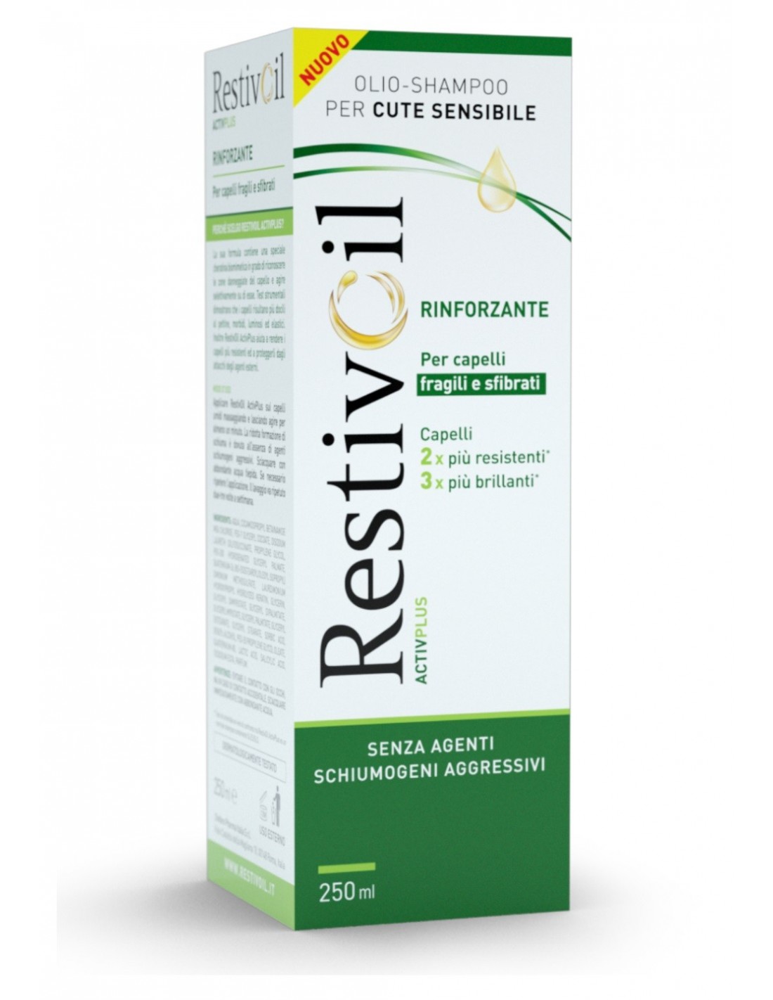 L'Olioshampoo Restivoil Activ Plus svolge un'azione rinforzante ideale in caso di capelli fragili e sfibrati. RestivOil Activ Plus contiene una speciale cheratina biomimetica in grado di riconoscere le zone danneggiate del capello ed agire selettivamente su di esse. La formulazione dell'olioshampoo Restivoil Activ Plus unisce all'innovativa cheratina biomimetica l'efficacia della base lavante delicata senza SLES (Sodium Laureth Sulfate) e SLS (Sodium Lauryl Sulfate) .Test strumentali dimostrano che i capelli risultano più docili al pettine, morbidi e luminosi. Restivoil Activ Plus dona capelli fino a 2 volte più resistenti e a 3 volte più brillanti.