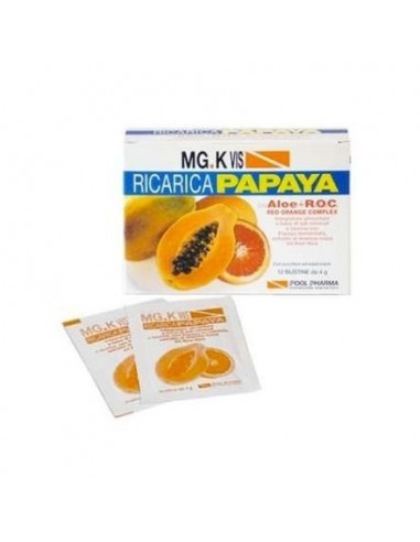 MGK Vis Ricarica Papaya è un integratore alimentare a base di papaya fermentata aiuta ad attenuare gli effetti dell’invecchiamento precoce dovuto all’azione dei radicali liberi. L’estratto di aloe vera svolge un’azione depurativa e immunostimolante e l’estratto di arancia rossa (ROC – Red Orande Complex) garantisce una naturale azione protettiva. Magnesio, potassio e taurina rafforzano la capacità muscolare e svolgono un’azione rivitalizzante ed energetica.