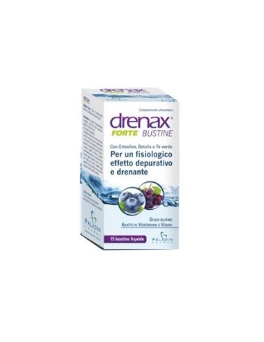 Drenax forte è un integratore che grazie ai principi di cui si compone, favorisce la depurazione dell'organismo e il drenaggio dei liquidi stagnanti nei tessuti. Drenax Forte bustine è un complemento alimentare a base di Rutina ed estratti vegetali di Ortosifon, Betulla, Pilosella, Opuntia, Centella asiatica, Cardo mariano, Carciofo, Uva, Mirtillo e Lespedeza. L’Ortosifon e la Betulla sono utili per favorire un fisiologico effetto drenante e depurativo.Nel formato in bustine Drenax forte è sufficiente per 10 giorni di trattamento, dopo dei quali i risultati daranno visibili: silhouette sgonfia, cellulite ridotta e pelle luminosa.