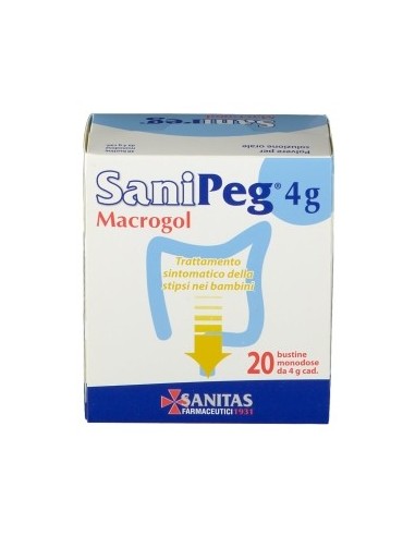 Sanipeg 4g Macrogol Polvere per Soluzione Orale è utile nel trattamento sintomatico della stipsi. Il Macrogol è un polimero inerte idrosolubile ad alto peso molecolare che ha la capacità di legarsi all’acqua utilizzata per l’assunzione trattenendola nelle feci. Determina una reidratazione ed un ammorbidimento della massa fecale e ne facilita l’evacuazione. Accelera il transito intestinale favorendo la peristalsi. Non viene assorbito o metabolizzato nel tratto gastro-intestinale e non porta a squilibri idro-elettrolitici, se assunto con la dose indicata di liquido. Dispositivo Medico CE.