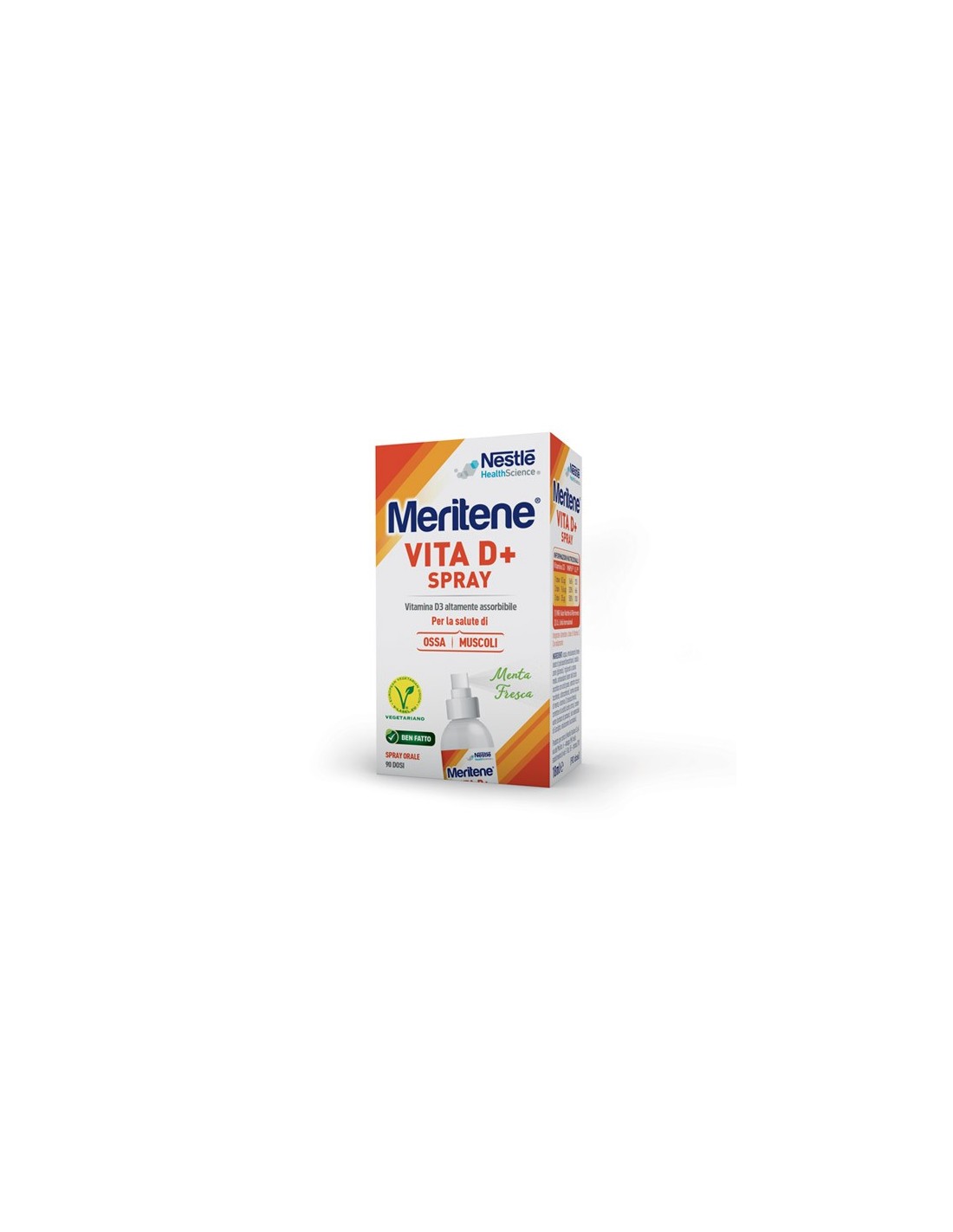 Meritene Vita D+ Spray è un integratore alimentare di Vitamina D3 altamente assorbibile pensato per favorire la salute di ossa e muscoli. Vita D+ aiuta a mantenere ossa e denti sani, migliora l'assorbimento del calcio e contribuisce alla normale funzione muscolare. La Vitamina D è essenziale per mantenersi in salute ed il suo fabbisogno aumenta con l'età. Questa vitamina, chiamata anche la "vitamina del sole" viene prodotta, infatti, dalla nostra pelle proprio durante l'esposizione al sole: eporre al sole braccia e gambe per un periodo di circa 15-30 minuti al giorno, può essere sufficiente a favorirne la sintesi cutanea. Tuttavia l’utilizzo di creme solari protettive nei confronti dei raggi UV riduce la sintesi della Vitamina D. La Vitamina D è fondamentale per tutte le donne in quanto il rischio di osteoporosi aumenta con l'insorgenza della menopausa. Un apporto adeguato di Vitamina D è necessario con l’ età, è dimostrato che un’integrazione giornaliera di almeno 20-25 mcg (800-1000 IU) di Vitamina D contribuisce alla funzione muscolare e può aiutare a ridurre il rischio di cadute e fratture del 20%. Meritene Vita D+ Spray è un integratore senza glutine e adatto ai vegetariani. Senza zuccheri, coloranti, OGM.