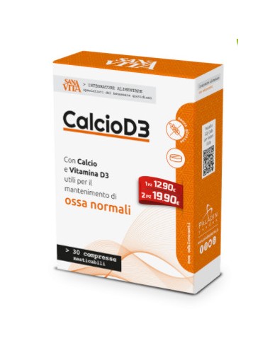 Sanavita Calcio Vitamina D3 è un complemento alimentare che aiuta a mantenere le ossa normali. La sua formula a base di Calcio e Vitamina D3 contribuisce a contrastare il problema della fragilità ossea. In caso di uso prolungato è necessario il parere del medico. Ogni compressa contiene 600 mg di Calcio e 10 mg di Vitamina D3. Non usare il prodotto in caso di patologia epatica o renale, in gravidanza e al di sotto dei 14 anni se non dopo aver sentito il parere del medico. Gli integratori non vanno intesi come sostituti di una dieta variata. Tenere fuori dalla portata dei bambini al di sotto dei 3 anni. Conservare in luogo fresco e asciutto.