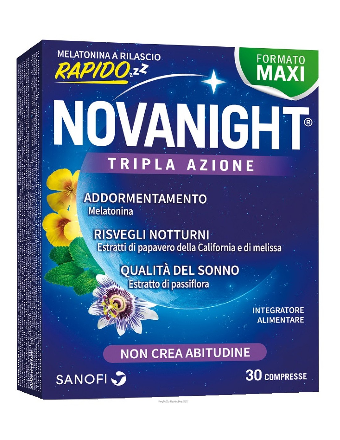 - estratto di passiflora (100% di origine vegetale): favorisce la qualità del sonno. Grazie alla nuova tecnologia di Novanight, la melatonina viene rilasciata più rapidamente, entro i primi 15 minuti di assunzione.