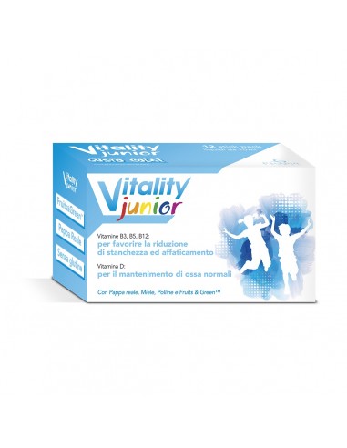 Vitality Junior è un valido sostegno che fornisce vitamine e sali minerali utili durante le fasi critiche di crescita di bambini e adolescenti. Contribuisce al buon funzionamento dei processi metabolici energetici e alla riduzione di stanchezza e affaticamento. La sua formulazione a base di Pappa reale, Polline, Miele, Concentrato di frutta e vegetali Fruits & Green™, Fluoro e Vitamine (B3, B5, B12, D3) favorisce la riduzione di stanchezza ed affaticamento e contribuiscono al normale metabolismo energetico. La Vitamina D contribuisce al mantenimento di ossa normali ed il Fluoro favorisce la normale mineralizzazione dei denti. Vitality Junior è il giusto integratore alimentare per il corretto sviluppo osseo nei bambini e nei ragazzi durante la crescita. L'assunzione di Vitality Junior è particolarmente utile in caso di stanchezza, affaticamento, cambio di stagione, attività fisica, convalescenza, inappetenza. Gradevole anche per i bambini più piccoli.