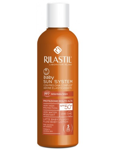 Il Latte Solare Fluido Rilastil Sun System Baby con SPF 50+ è ideale per proteggere dedicatamente dai raggi solari i bambini con pelle molto chiara e sensibile. La formula unica del Latte Fluido Rilastil Sun System Baby garantisce una protezione solare ad ampio spettro, idratanto la pelle delicatissima del bambino ed aiutando a prevenire eritemi, macchie, scottature, arrossamenti e processi ossidativi che conducono ad un invecchiamento cutaneo precoce. Il Latte Fluido della linea Rilastil Sun System Baby è resistente all'acqua ed è dermatologicamente testato per ridurre al minimo il rischio di allergie. Senza parabeni, coloranti, alcool, profumo.