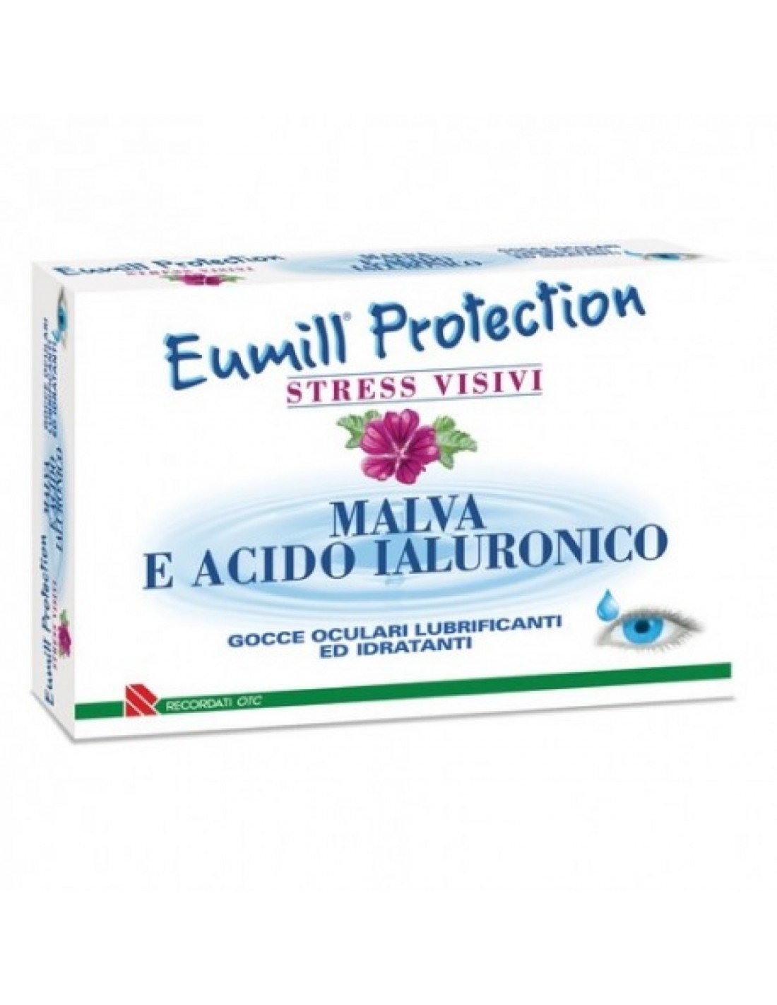 Le Gocce Oculari Eumill Protection grazie alla loro azione lubrificante e idratante sono perfette da utilizzare in caso di occhi secchi, stanchi ed arrossati. Grazie alla sua formulazione a base di acqua distillata di Malva e Acido Ialuronico garantisce infatti una piacevole sensazione di freschezza, idratando e donando sollievo all'occhio. L'acido ialuronico svolge una profonda azione idratante e in associazione all'acqua distillata di malva lubrifica l'occhio rendendo le Gocce Oculari Eumill Protection particolarmente indicate per alleviare secchezza, affaticamento oculare, sensazione di corpo estraneo e arrossamento causati da: stress visivi (come uso prolungato del computer o permanenza prolungata davanti alla TV, uso di lenti a contatto), aria secca e impurità presenti nell’aria (dovute a impianti di riscaldamento, aria condizionata, polvere, smog, inquinamento atmosferico), altre condizioni che possono alterare la normale lacrimazione. Indicato nei portatori di lenti a contatto in quanto non interferisce in alcuno modo con le prestazioni delle lenti. Eumill Protection è adatto anche ai bambini.