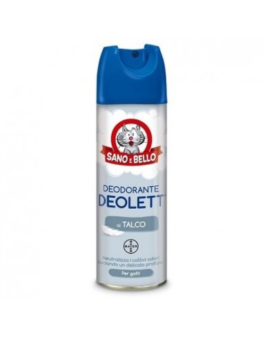 Il deodorante Deolett al talco Sano e Bello di Bayer è stato sviluppato per tamponare l'odore sgradevole delle lettiere. La formula del deodorante Deolett prevede una particolare miscela con Metazene, indicato per distruggere le molecole del cattivo odore. Deolett è ben tollerato dal gatto e l>ascia una gradevole fragranza al talco. Il deodorante Deolett al talco Sano e Bello di Bayer non mancchia e non unge l'ambiente.